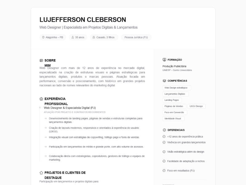 Ideal como template de currículo online ou mini-portfólio para web designers, profissionais de marketing digital e freelancers que precisam de uma apresentação profissional rápida de personalizar e publicar.