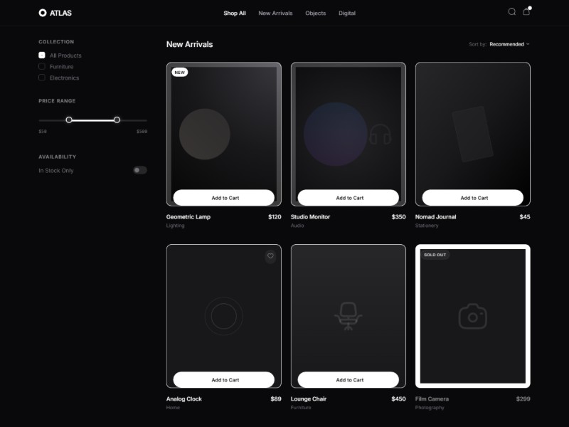 A sleek dark-mode e-commerce storefront template for showcasing modern products with filters, product cards, and cart-ready interactions.