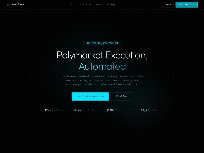 Morpheye is a professional-grade landing page template for automated trading solutions. It showcases a high-performance CLI environment optimized for prediction markets like Polymarket. The design emphasizes speed, featuring a minimalist dark aesthetic with futuristic cyan accents.