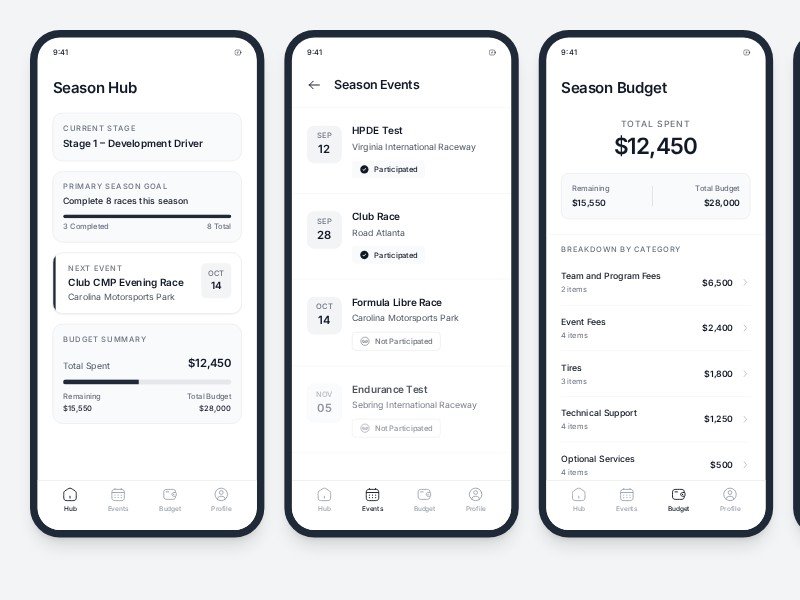 A clean mobile app template built for motorsport programs, racing drivers, and teams managing a full season of events, goals, and spending.