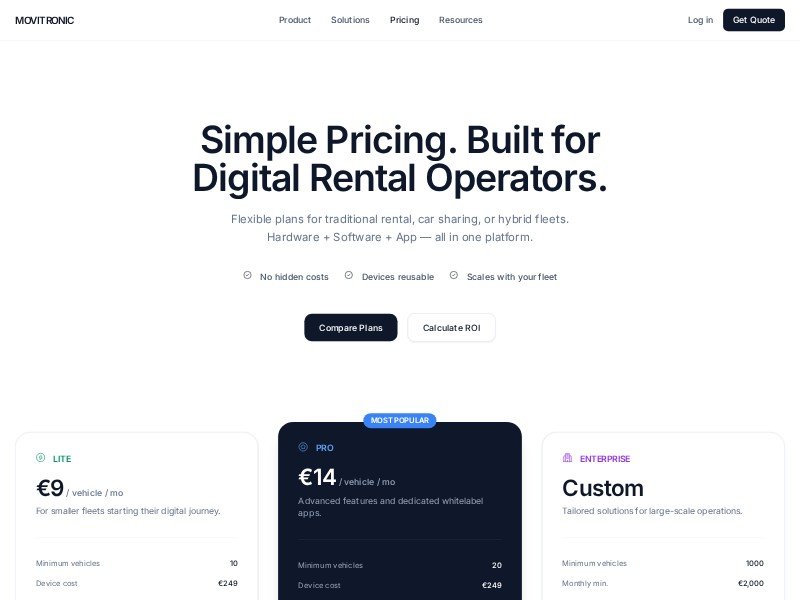 A modern Movitronic-inspired pricing landing page template for digital vehicle rental and car sharing platforms, featuring plan comparison, ROI calculator, and lead capture.