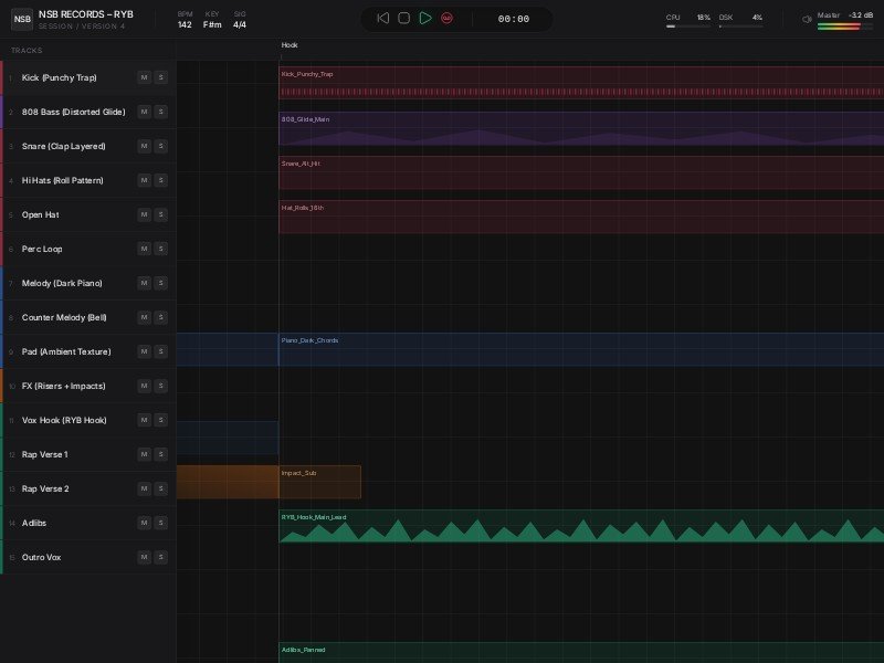 A reusable template for showcasing a realistic music production session interface, perfect for audio apps, DAW concepts, and studio dashboard demos.