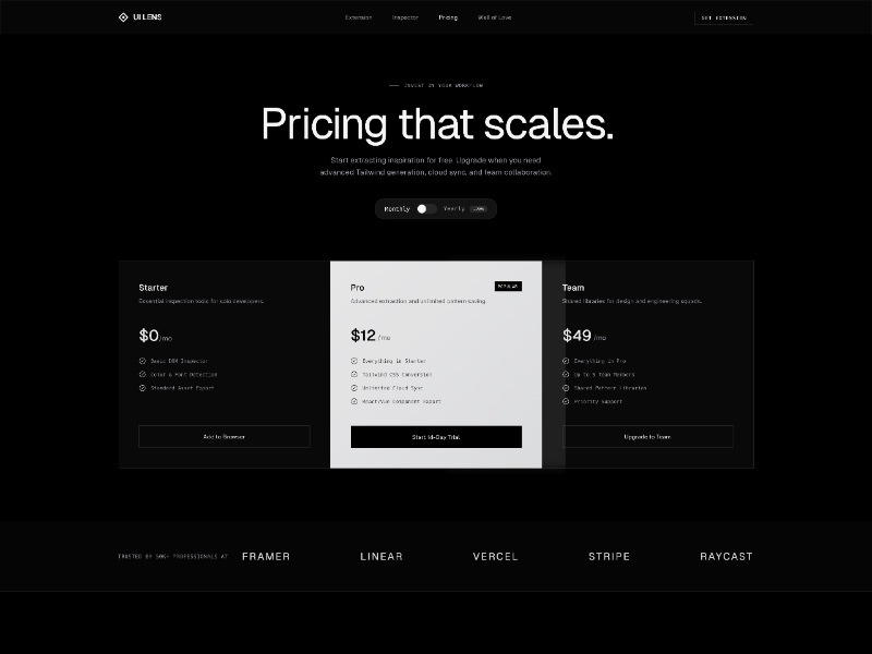 A bold, dark-themed pricing landing page template for software products, browser extensions, and developer tools that need to present plans clearly and drive upgrades.