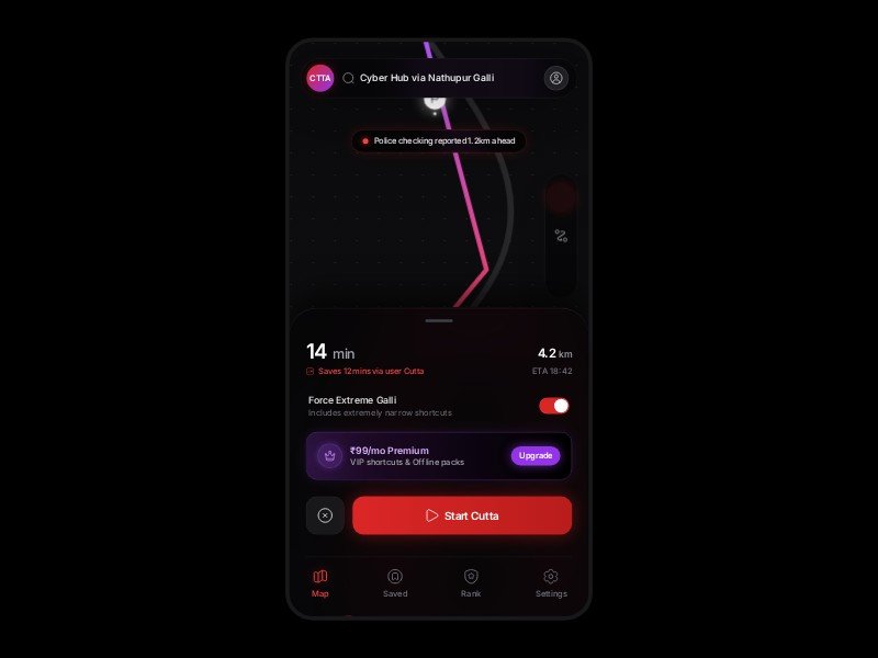 A reusable mobile app template for showcasing hyper-local navigation, shortcut routing, hazard alerts, and premium upgrade flows.