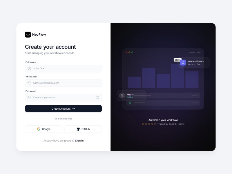 - Dark sidebar + light content, gradient accents, and micro-interactions