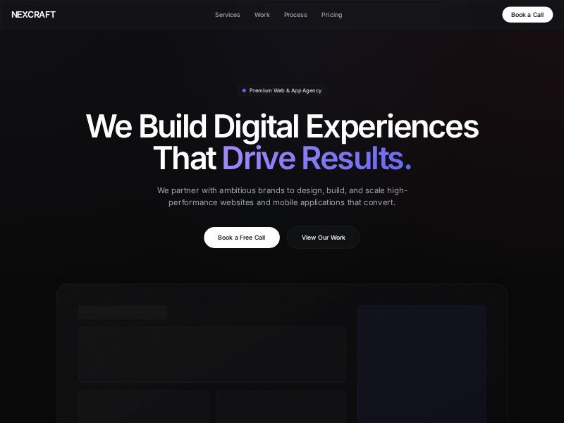 A premium NEXCRAFT agency landing page template for showcasing web and app development services, portfolio, pricing, and FAQs for digital studios.