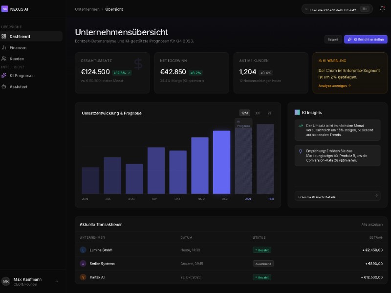 A reusable Nexus AI business analytics dashboard template for real-time company KPIs, financials, and AI-powered forecasts in a modern dark UI.