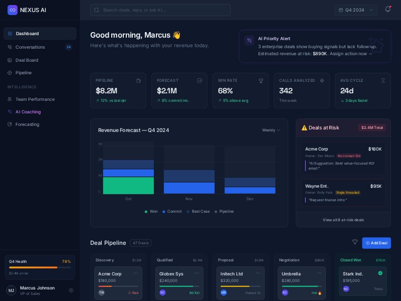- Sidebar navigation with sales workflow sections (Dashboard, Pipeline, Forecasting, AI Coaching)