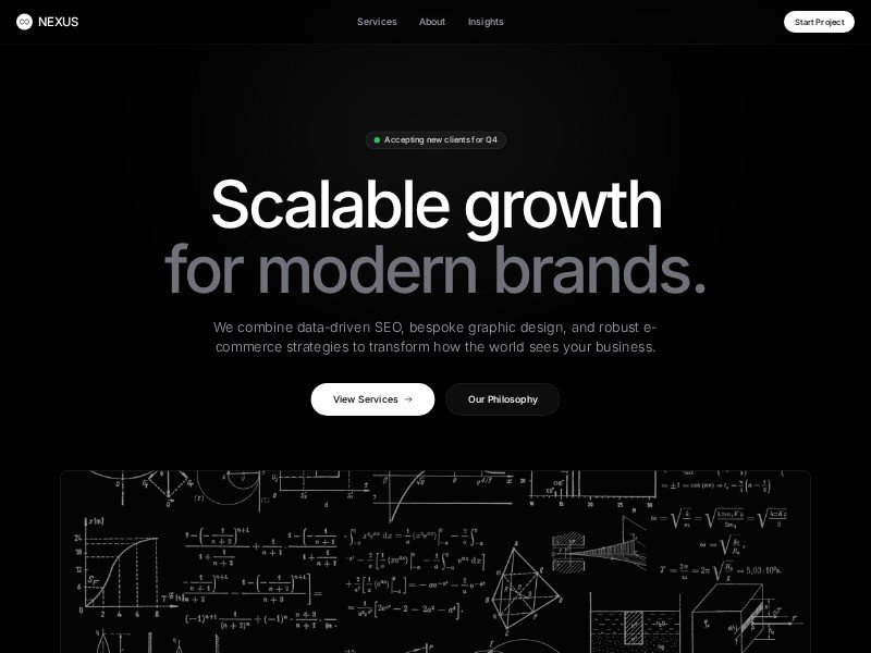 A dark, modern Nexus Marketing agency landing page template for showcasing digital services like SEO, graphic design, and e-commerce to win new clients.
