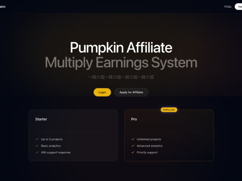 Pumpkin Affiliate Landing Page Template is a dark, glassmorphism-style layout built to showcase your affiliate or partner earnings system with clear CTAs.