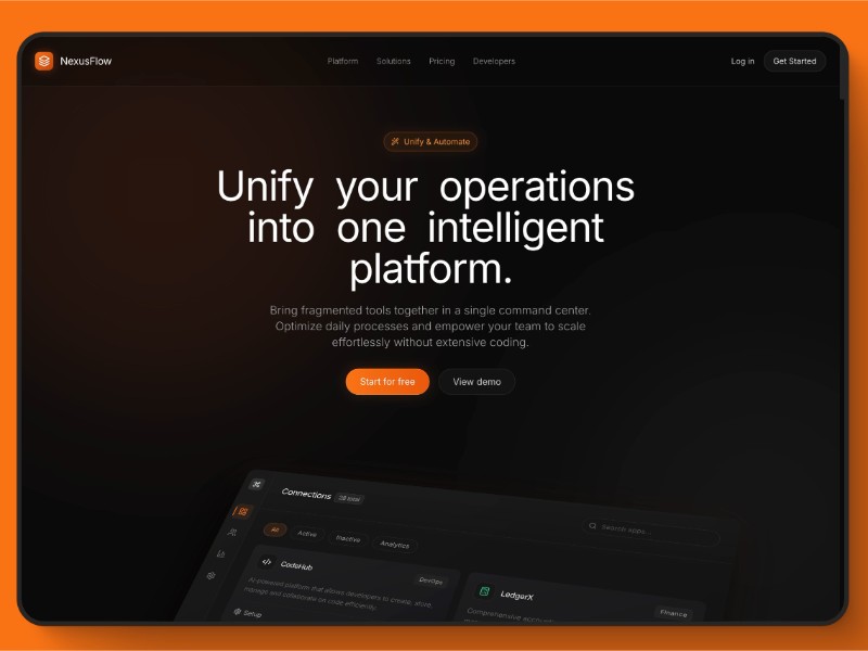 NexusFlow is a premium landing page template tailored for automation, SaaS, and infrastructure companies. It features a sophisticated dark mode aesthetic with orange accents and high-end cinematic lighting effects. Built with Tailwind CSS and GSAP, it provides a high-performance, developer-first experience.