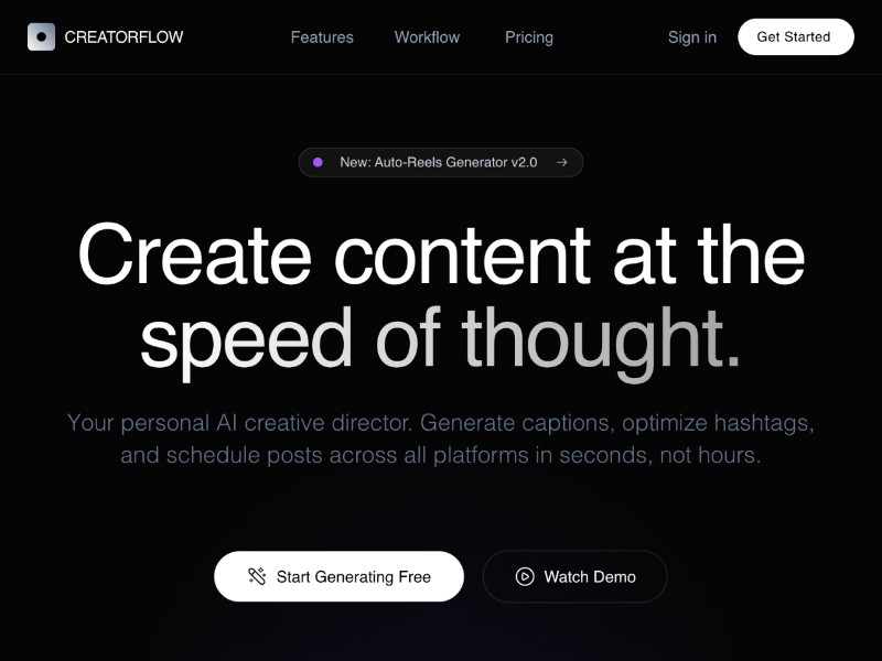 A dark, futuristic SaaS landing page template for AI-powered creator tools, perfect for showcasing features, workflows, and pricing for content platforms.