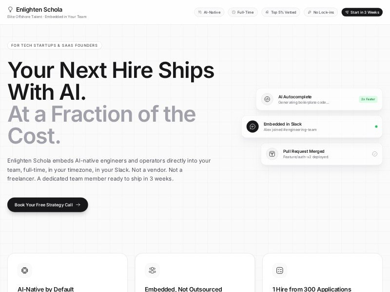 A polished, conversion-focused landing page template for agencies and services offering AI-native offshore talent to startups and SaaS companies.