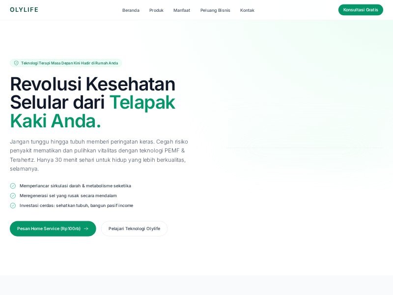Template landing page berbahasa Indonesia untuk memasarkan produk kesehatan premium seperti Olylife Tera P90, lengkap dari edukasi teknologi hingga peluang bisnis.
