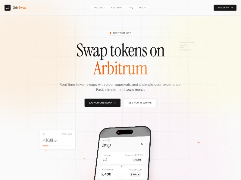 - Ideal for DeFi teams and Web3 builders who need a ready-made, on-brand landing page template to showcase a non-custodial token swap or DEX experience on Arbitrum or similar L2 networks.