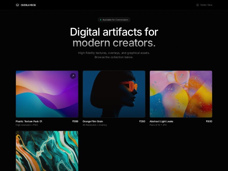 OverlayBox is a sleek dark-mode template for showcasing and selling high-fidelity digital overlays, textures, and graphical assets.