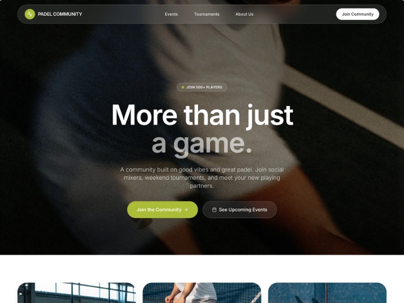 A modern Padel League community landing page template for promoting games, tournaments, and leagues while growing a local padel player community.