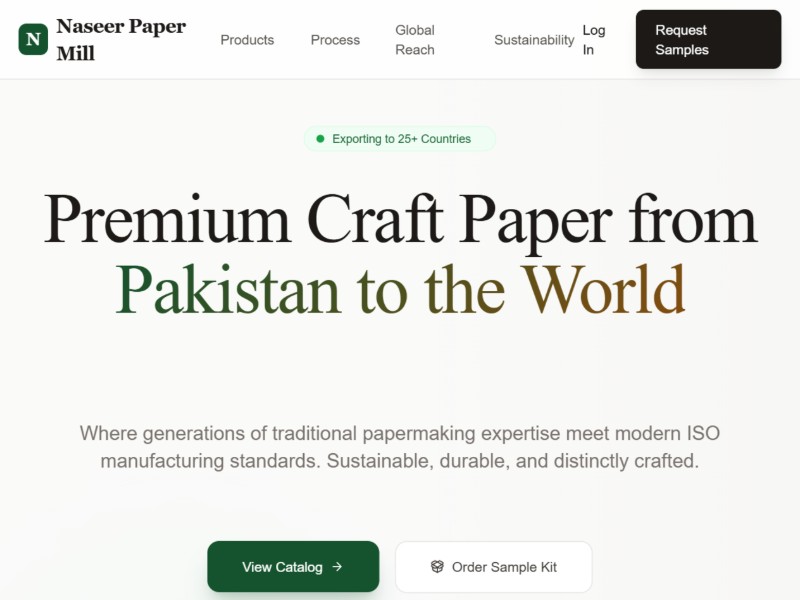 A refined landing page template for paper mills and industrial manufacturers to showcase products, global exports, and capture custom quote requests.