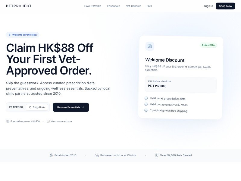 A clean, conversion-focused template for pet health and veterinary e-commerce brands promoting first-order discounts, curated essentials, and consult-based purchasing.