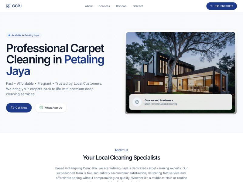A conversion-focused template for local carpet, sofa, and upholstery cleaning businesses, built with Tailwind CSS and a clean, trustworthy layout.