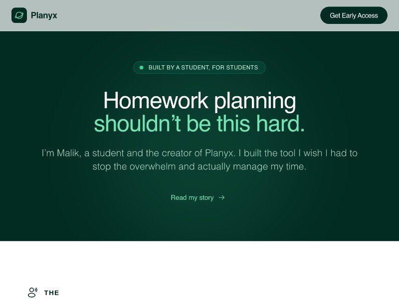 A modern landing page template for Planyx, a student-focused homework planning app, perfect for showcasing features, story, and early-access signups.