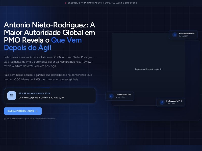 A high-converting landing page template for PMO conferences, executive summits, and speaker-led business events. Built for promoting keynote speakers, showcasing agenda highlights, and driving qualified inquiries.