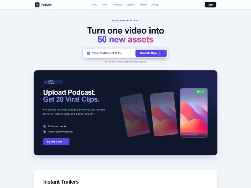 A modern PodGen-inspired landing page template for AI podcast video repurposing platforms, helping creators turn one video into 50+ viral-ready content assets.