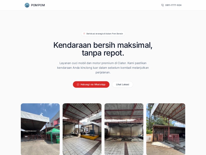 A reusable landing page template for car wash businesses to showcase services, pricing, promos, location, and WhatsApp booking in a clean format.