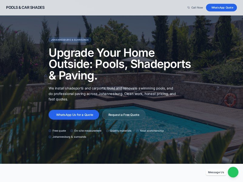A reusable landing page template for Johannesburg-based pool, shadeport, and paving service businesses to showcase projects and capture WhatsApp quote requests.