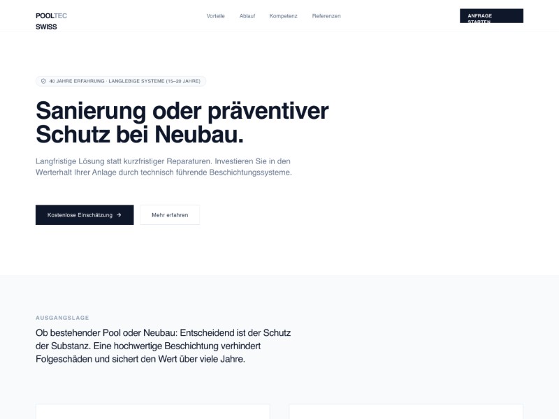 Dieses Template ist für Unternehmen konzipiert, die Poolbeschichtung, Poolbau und Sanierung in der Schweiz anbieten und qualifizierte Anfragen generieren wollen.