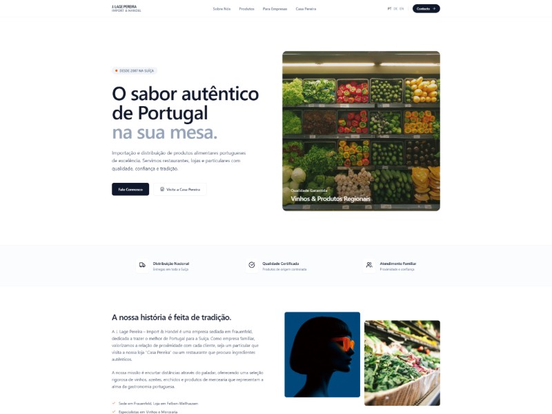 A modern landing page template for Portuguese food import and distribution businesses to showcase products, B2B services, and retail store information.
