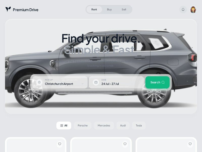 A modern Premium Drive car rental landing page template for showcasing premium fleets and AI-powered booking with sleek search and booking UI.