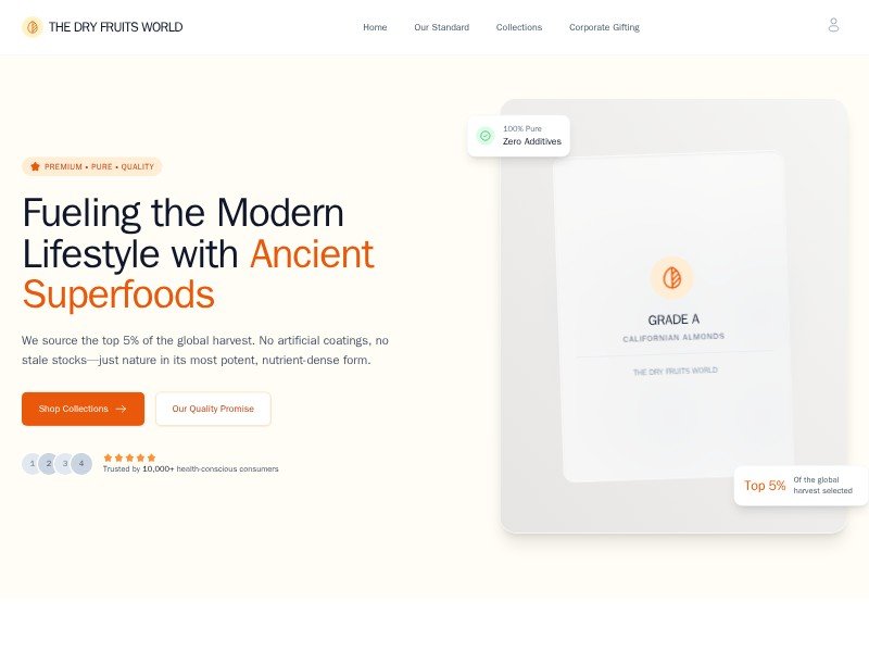 A reusable e-commerce template for premium dry fruits, nuts, and healthy snack brands showcasing products, sourcing, gifting, and trust-building content.