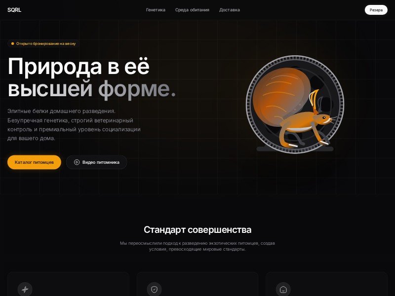 Premium dark-style landing page template for an elite exotic pet or squirrel breeding kennel, ready to customize for your brand and online reservations.