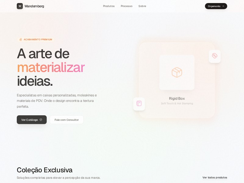 A sleek, gradient-driven landing page template for premium print finishing studios offering custom boxes, moleskines, and PDV materials.