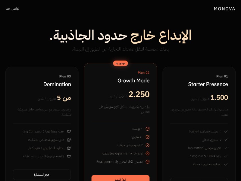 MONOVA Arabic Agency Pricing Page Template is a dark, minimalist RTL layout built to present clear, aspirational service tiers for creative and marketing agencies.