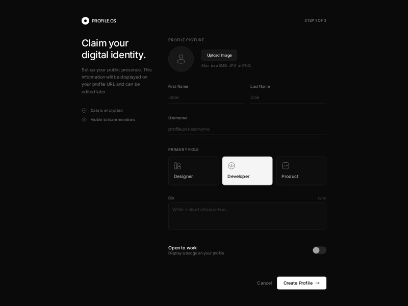 PROFILE.OS Profile Creation Form UI Template delivers a modern, dark-mode onboarding experience for any web app that needs rich user profiles.