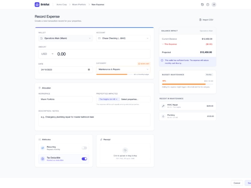 A modern template for recording property expenses with wallets, allocations, receipts, and live budget impact—ready to reuse in your finance or real estate app.