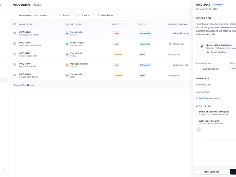 A modern property management work orders dashboard template for tracking maintenance, vendors, and costs in a clean, data-rich UI.
