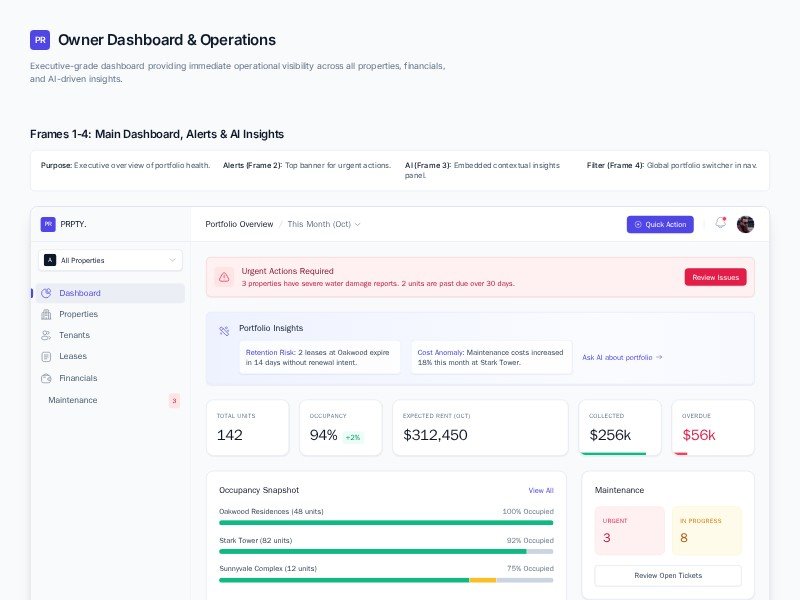 A reusable SaaS dashboard template for property management teams to monitor portfolio health, financials, maintenance, renewals, and AI-driven insights.