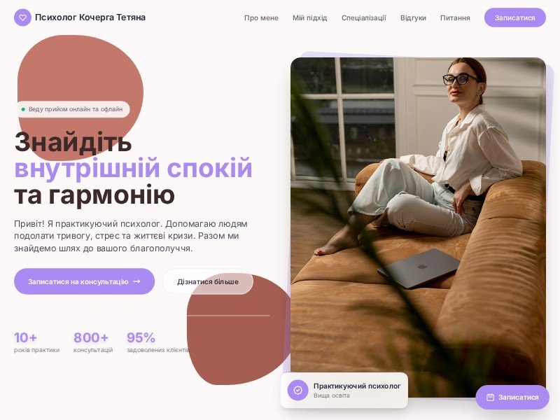 Ідеально як стартовий шаблон сайту для психологів, психотерапевтів та експертів з ментального здоров’я, які хочуть швидко вийти онлайн.