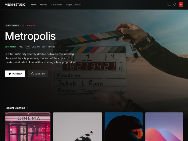 Melvin Studio Public Domain Movie Template delivers a premium, dark streaming experience for classic and public domain films.