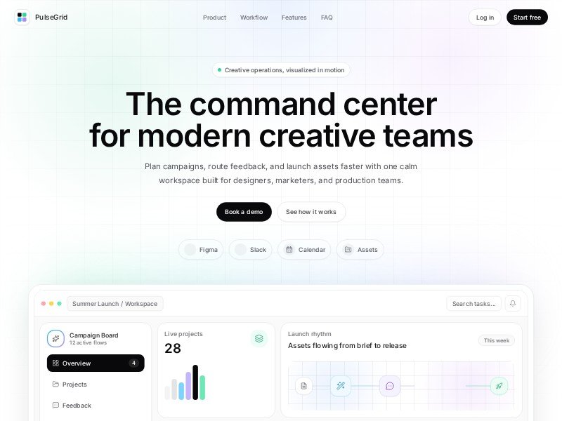 PulseGrid is a sophisticated SaaS Landing Page Template specifically crafted for creative operations and project management. It features a high-fidelity visual system that uses expressive panels and soft gradients to showcase product features without the weight of traditional screenshots.