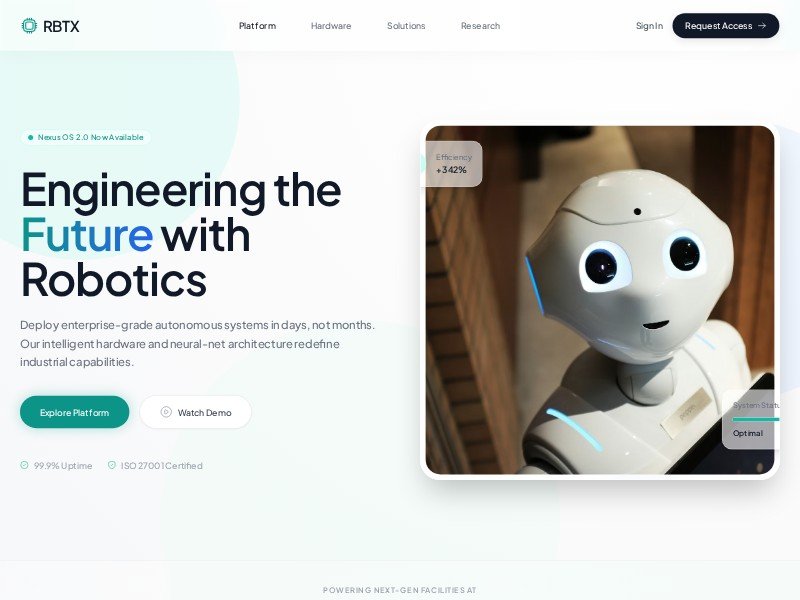 This RBTX template is a premium landing page solution for robotics and deep-tech companies. It features a sophisticated design with glassmorphism effects, ambient background animations, and a high-end interactive hardware showcase.