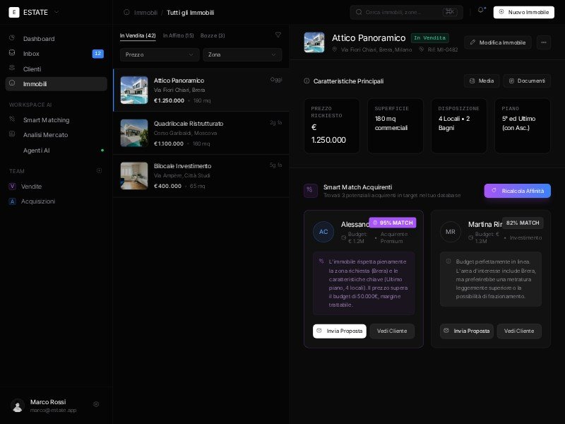 Estate CRM is a dark, modern dashboard template designed for real estate agencies to manage clienti and match them with properties using AI.