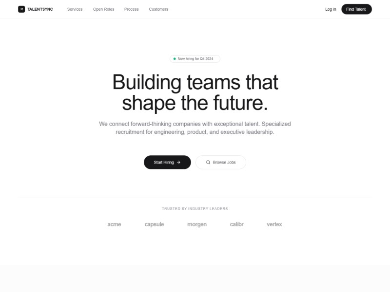 A modern TalentSync-inspired recruitment landing page template for agencies to showcase services, open roles, and capture hiring leads.
