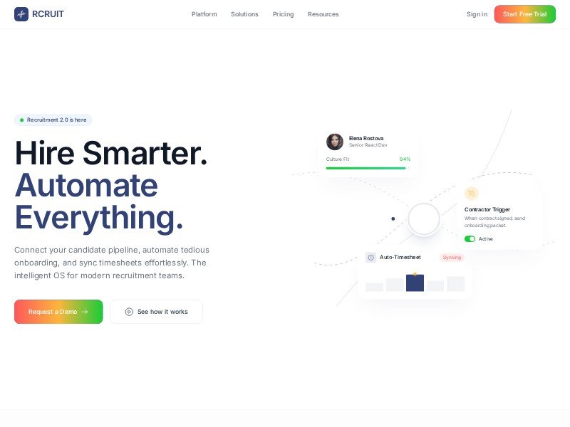A reusable landing page template for recruitment and HR software brands to showcase sourcing, onboarding, automation, and timesheet workflows.