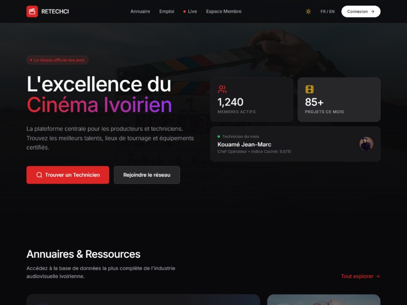 A modern template for building a professional cinema technicians network landing page, reusable for film associations and industry communities.