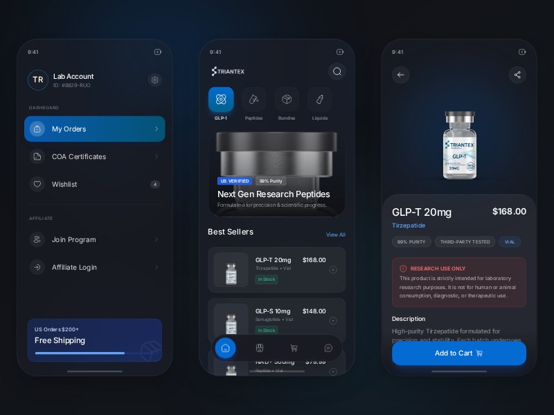 Dark, lab-grade mobile commerce layout inspired by Triantex, perfect for research peptide or lab supply brands.