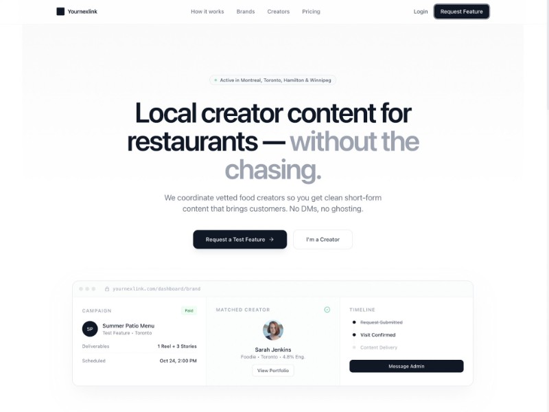 A clean, conversion-focused template for platforms that match restaurants with vetted local food creators.